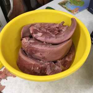 Cuts of meat are boiled for one or two hours prior to dicing. This water will be reused, so do not discard; this is Brühe (tr., broth). If you are simultaneously making both Rotwurst and Sülze, reserve the fattier pieces for the Rotwurst. The boiled meat should be cubed into one-quarter to one-half inch pieces. For presentation purposes, kidney and tongue pieces should be up to three-quarters inch.