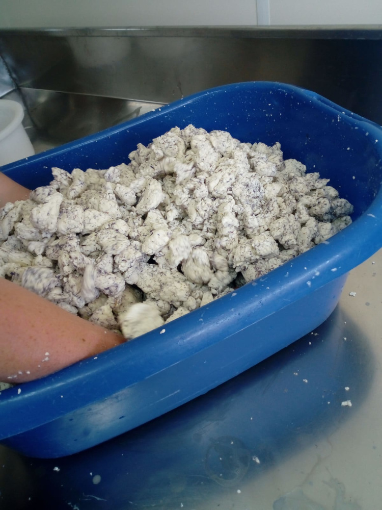 Our first week’s trial had much of our color running away with the whey that was being expelled during salting. As a result, we did not see much of the blue color left in the cheese. We needed a new plan for the next week’s batch.