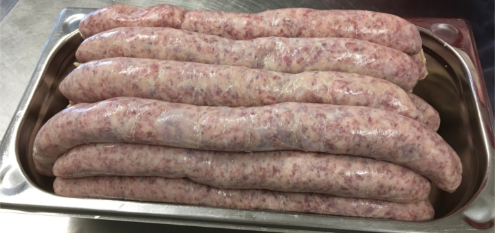 A pork mixture in a cow casing, with a mixture of seasoning.